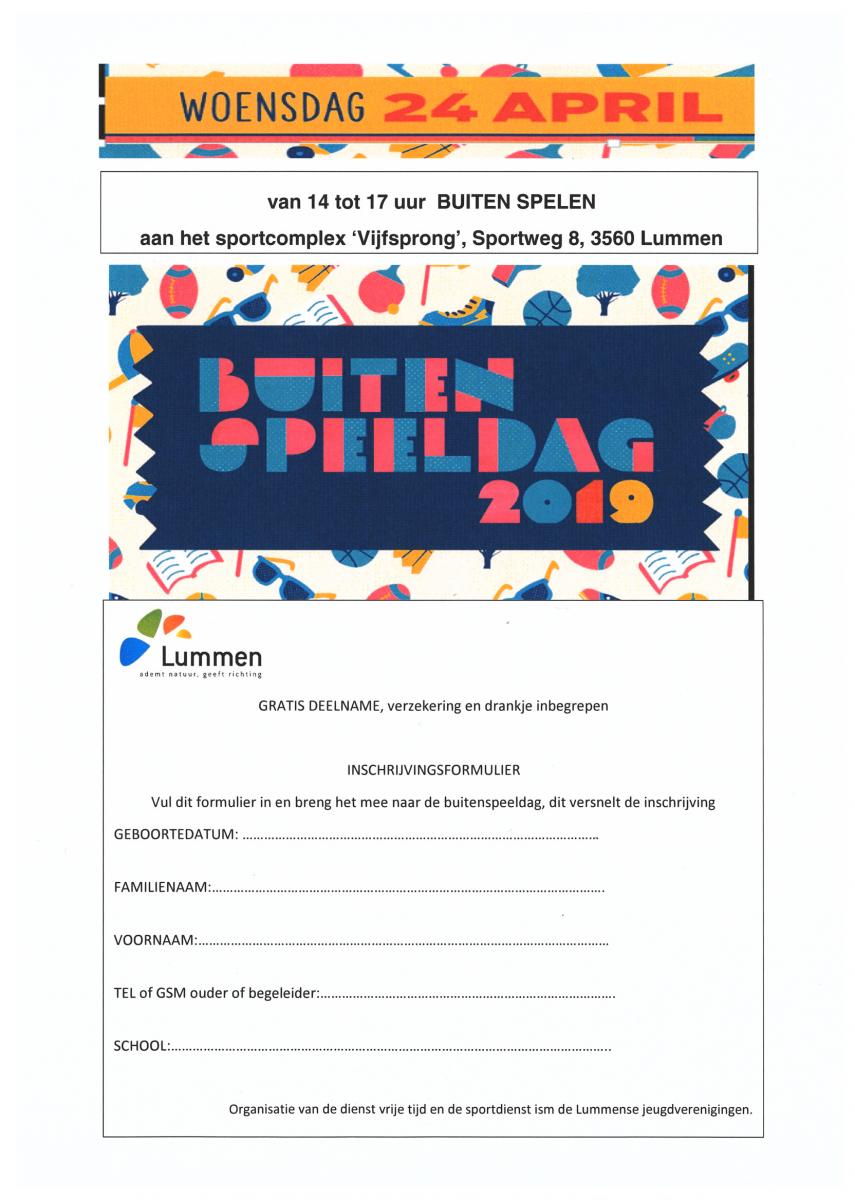 In Lummen speelt alles zich af op en rond de sportterreinen aan sportcomplex Vijfsprong, van 14.00 tot 17.00 uur, in een verkeersvrije omgeving. De kinderen kunnen vrij rondlopen en kiezen aan welke activiteit ze deelnemen: voetbal, tennis, minigolf, gocart rijden, basketbal, hockey, dans ….