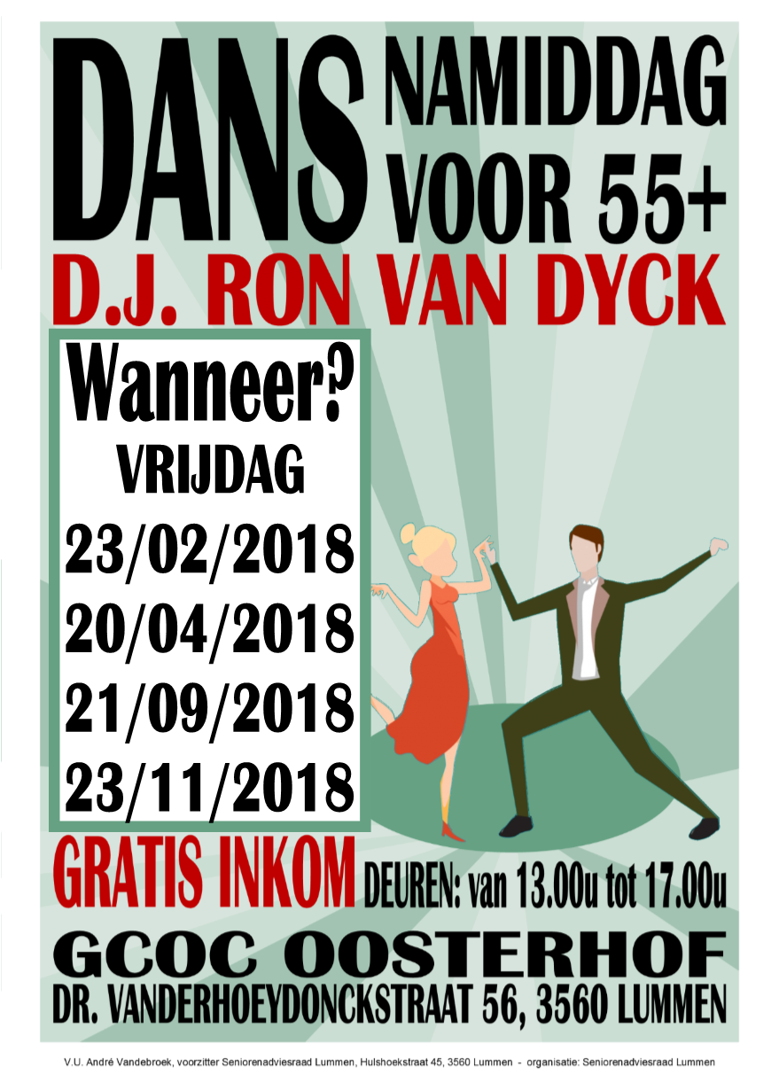 Dansnamiddag voor 55-plussers Locatie Dokter Vanderhoeydonckstraat 56 3560 LummenUrenOrganiser Seniorenadviesraad LummenPrijs € 0,00Type evenement SportactiviteitThema Fitness, gymnastiek, dans en vechtsport