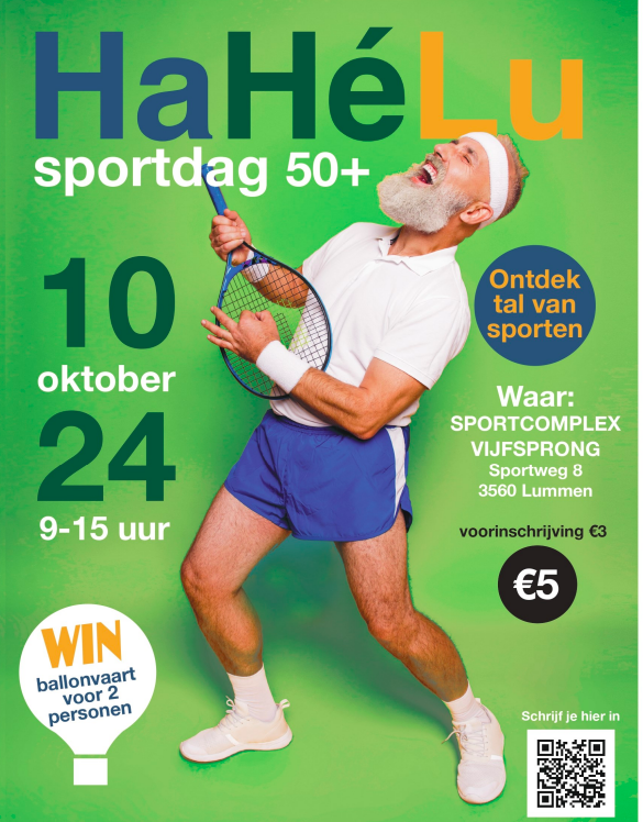 Op donderdag 10 oktober 2024 organiseren de sportdiensten en de lokale dienstencentra van Halen, Herk-de – Stad en Lummen de eerste HaHéLu Sportdag voor senioren in het Gemeentelijk sportcomplex Vijfsprong te Lummen. Dit is een vervolg op onze alom gekende Sporteldag maar dan georganiseerd door drie gemeentes samen. Het is een laagdrempelige sportdag voor 50+ met voor iedereen heel leuke, rustige en minder rustige activiteiten.