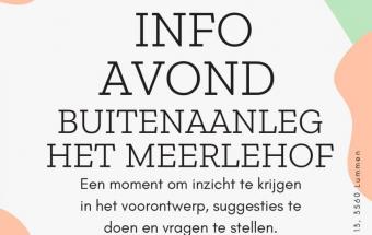 Op 15 mei organiseert het gemeentebestuur om 18u30 een infoavond over de buitenaanleg rond woonzorgcentrum in het Café kaffee van WZC Het Meerlehof, Wijngaardstraat 15. Stijn De Preter van studiebureau Landmeesters zal aanwezig zijn om het voorontwerp toe te lichten en alle vragen te beantwoorden