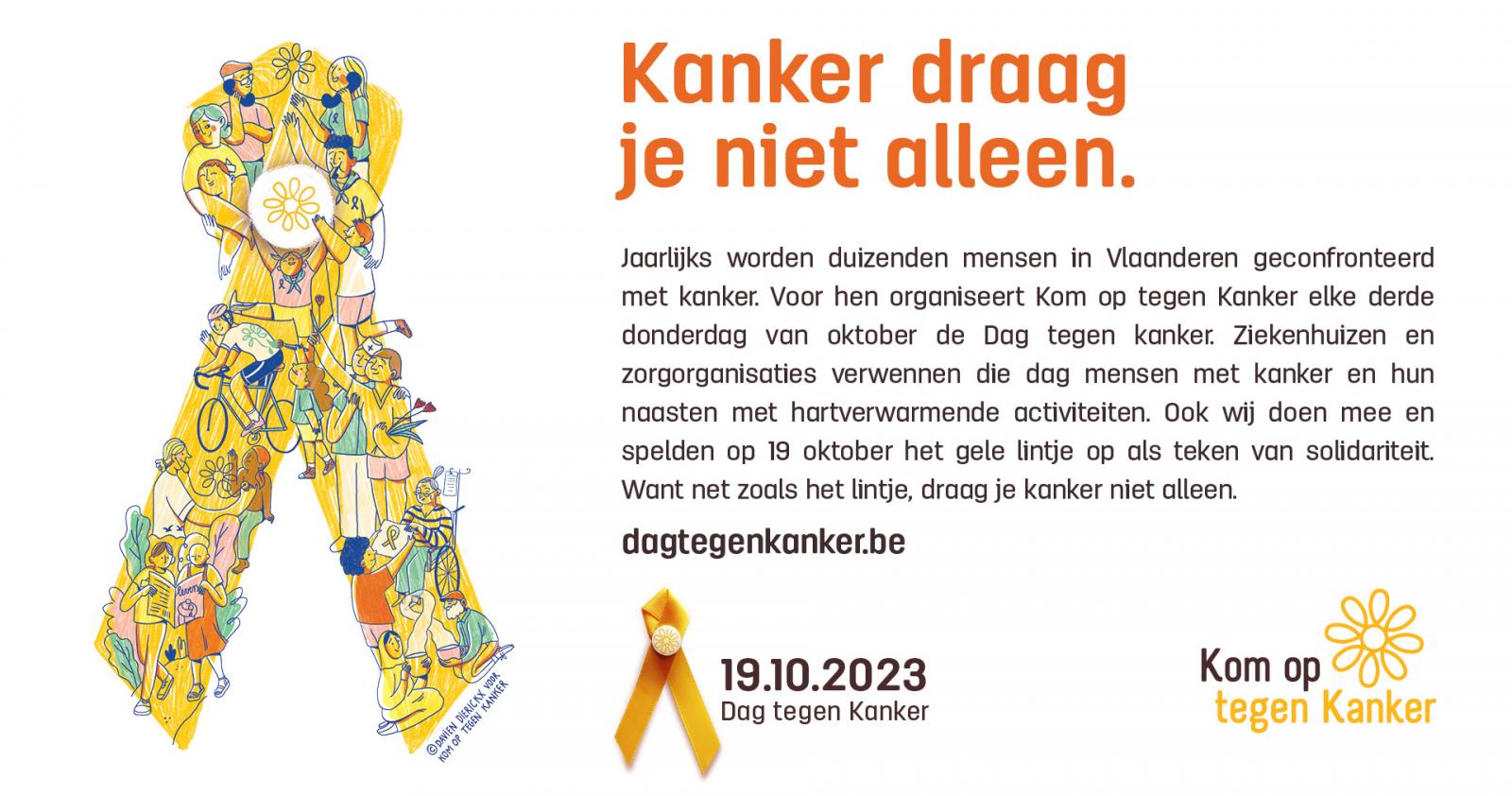 Jaarlijks worden duizenden mensen in Vlaanderen geconfronteerd met kanker. Voor hen organiseert Kom op tegen Kanker elke derde donderdag van oktober de Dag tegen Kanker. Ziekenhuizen en zorgorganisaties verwennen die dag kankerpatiënten en hun naasten met hartverwarmende activiteiten. Ook wij doen mee en spelden vandaag, 19 oktober, het gele lintje op als teken van solidariteit. Want net zoals het lintje, draag je kanker niet alleen.