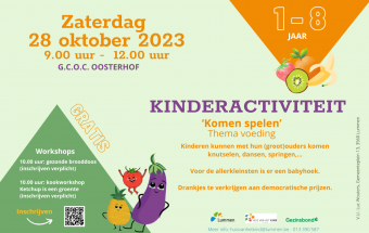 Huis van het Kind organiseert de kinderactiviteit 'Komen spelen'. Kinderen kunnen met hun ouders terecht voor allerlei leuke activiteiten die te maken hebben met het thema '(gezonde) voeding'. We hebben bijvoorbeeld 2 leuke kookworkshops voorzien! Inschrijven voor de workshops kan via https://reservaties.lummen.be/Tickets.aspx