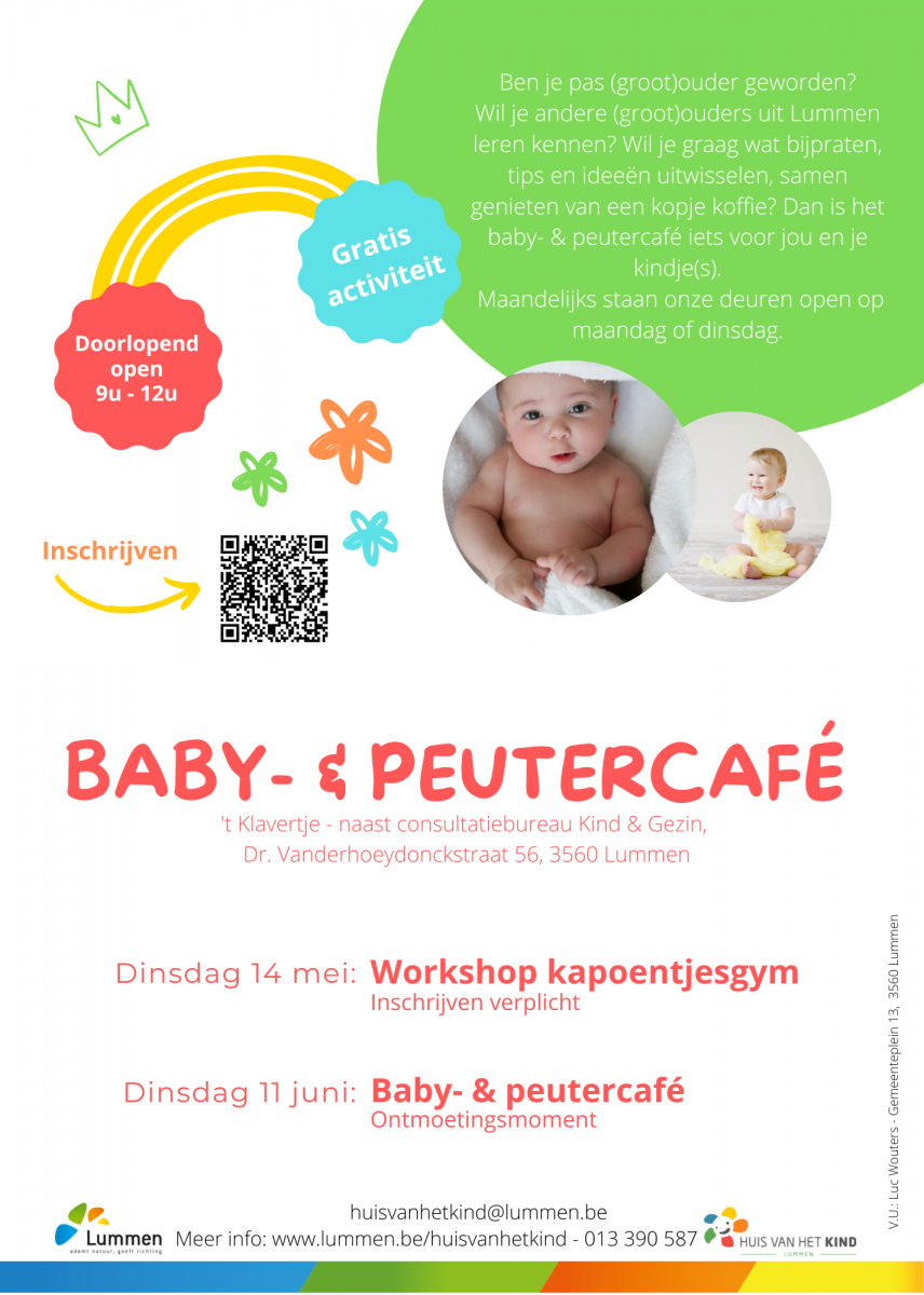 Maandelijks zet ons baby- en peutercafé de deuren open! Het baby- en peutercafé is een ontmoetingsmoment voor mama’s, papa’s, oma’s, opa’s, pleegouders, … en hun kindjes van 0 tot 3 jaar.