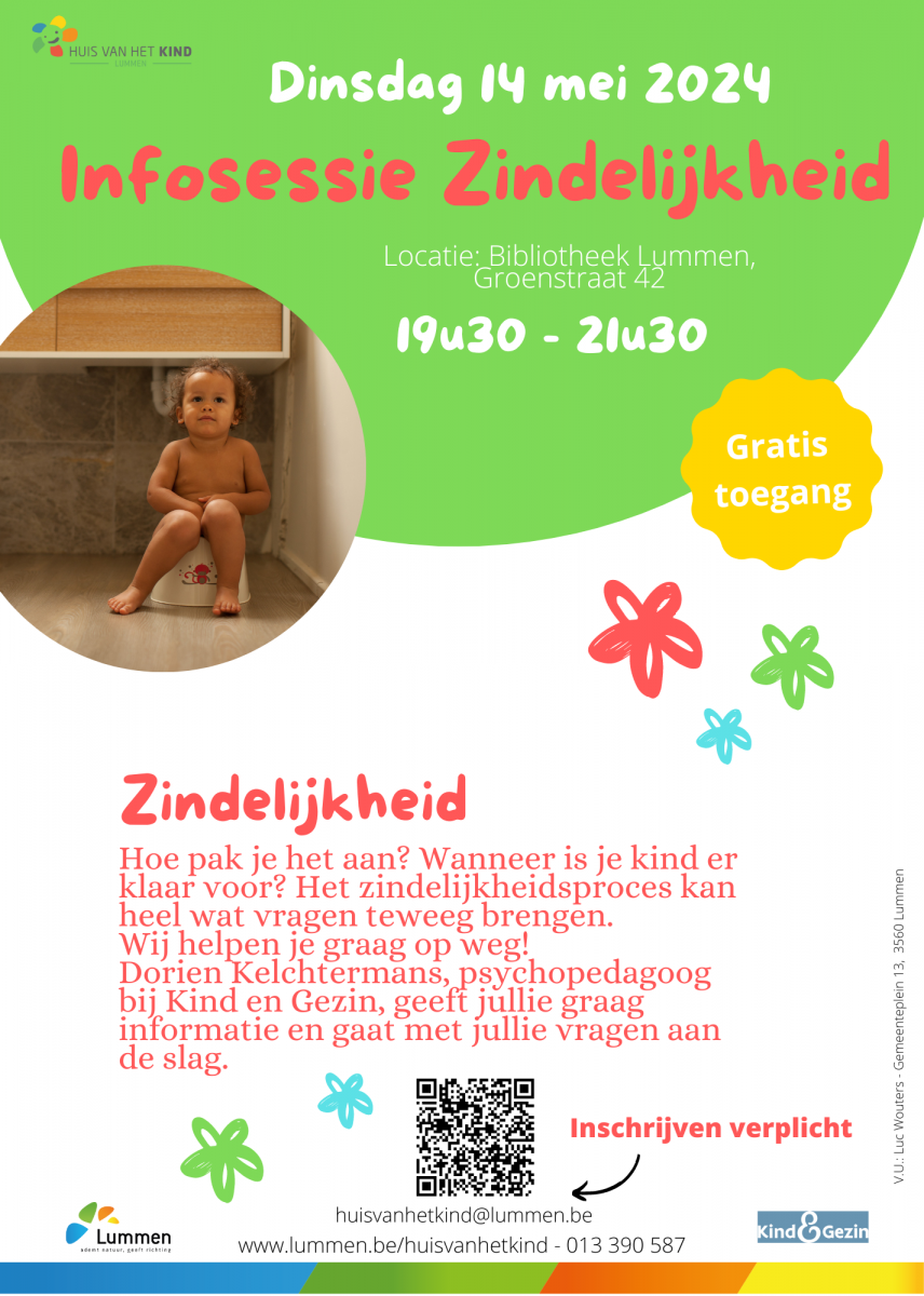 Zindelijkheid: hoe pak je het aan? Wanneer is je kind er klaar voor? Het zindelijkheidsproces kan heel wat vragen teweeg brengen. Wij helpen je graag op weg! Dorien Kelchtermans, Psychopedagoog bij Kind en Gezin, geeft jullie graag informatie en gaat met jullie vragen aan de slag. De infosessie gaat door op 14 mei om 19u30 in de bib van Lummen.