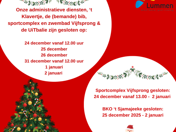 Tijdens de feestdagen passen we de openingsuren van onze dienstverlening aan. Hieronder vind je een volledig overzicht zodat je je bezoek goed kunt plannen.