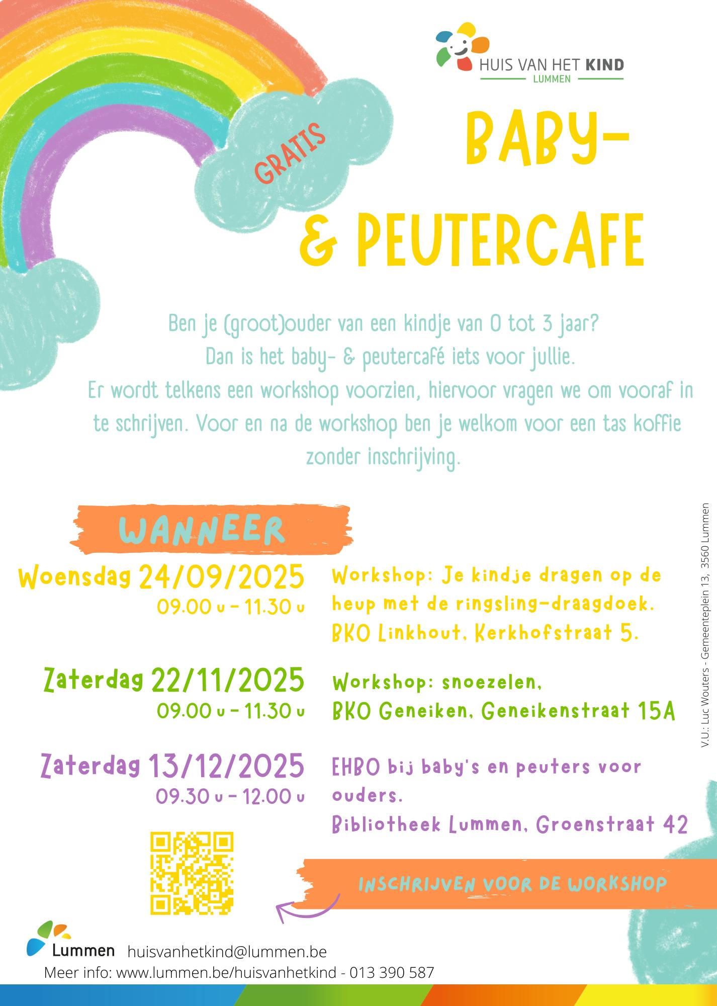 Kom samen met je kindje snoezelen tijdens dit baby- en peutercafé en krijg tips mee om thuis verder te snoezelen. Snoezelen is een samenvoeging van snuffelen en doezelen. Je kindje kan ontdekken, experimenteren, wegdromen, tot rust komen, ... met verschillende materialen. Er wordt een onderscheid gemaakt tussen kindjes van 0 tot 2 jaar en kindjes van 2 tot 3 jaar.